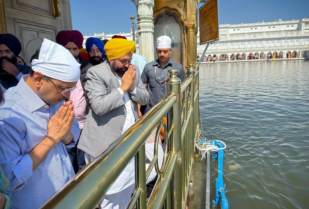 AAP convener Arvind Kejriwal and CM Bhagwant Mann pay obeisance at Sri Harmandir Sahib, Bhagwan Valmiki Tirath Sthal and Sri Durgiana Mandir